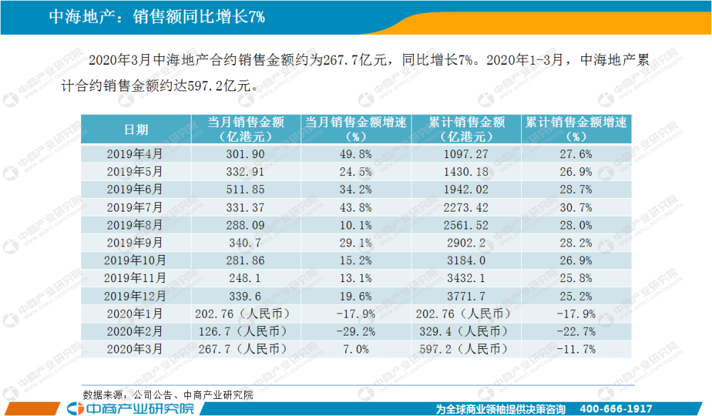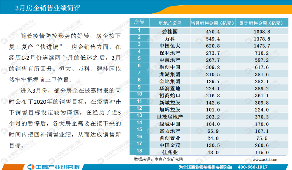 中商情报网讯:随着疫情防控形势的好转,房企按下复工复产“快进键”。房企销售方面,在经历1-2月份连续两个月的低迷之后,3月的销售有所回升。恒大、万科、碧桂园依然牢牢把握前三甲位置。
